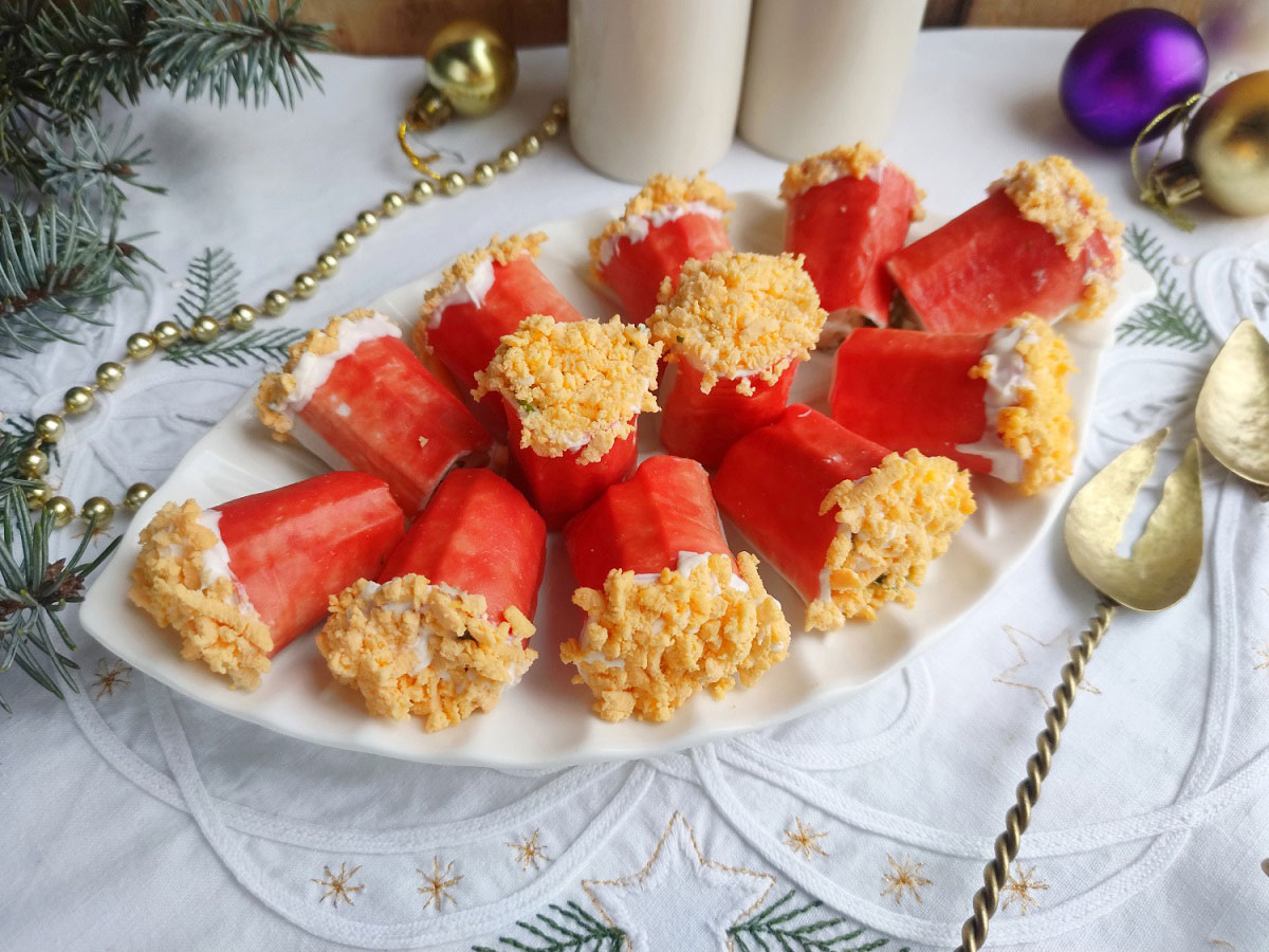 До святкування Нового Року залишається не так багато часу, настав час думати про меню до урочистостей. Щоб розвантажити господиню, деякі холодні закуски допускається приготувати напередодні. Одна з таких закусок – петарди із крабових паличок. Страва готується із простих та недорогих продуктів.