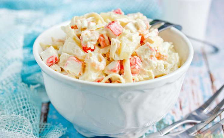 - Можете додатково прикрасити салат свіжими шматочками ананаса або невеликими вітрильниками з крабових паличок.